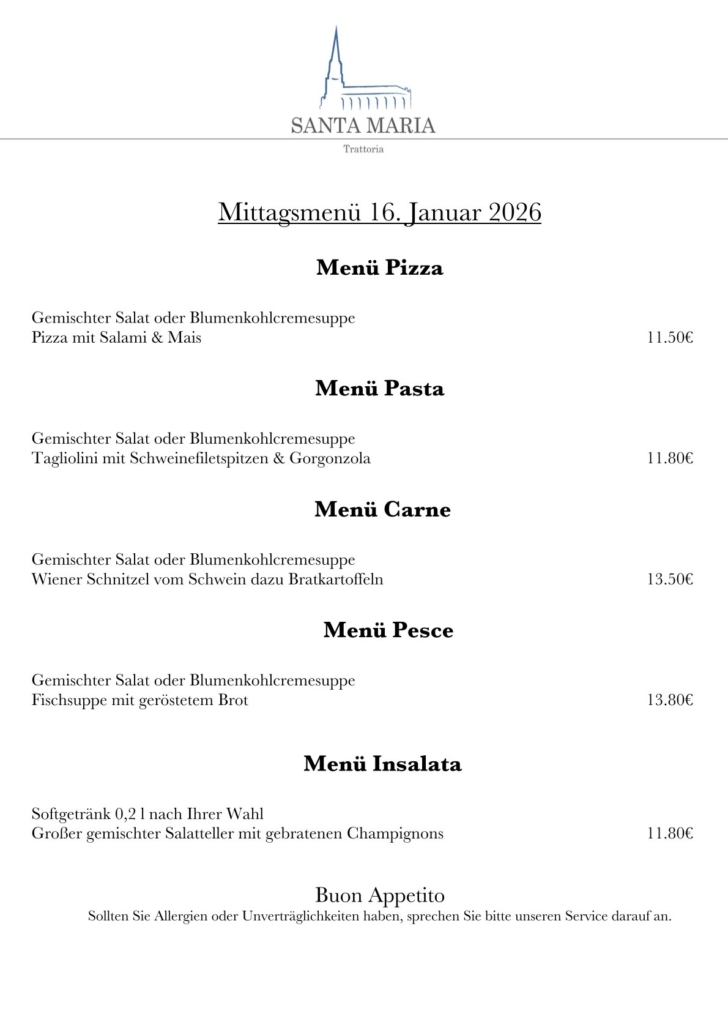 Von Montag bis Freitag (außer Feiertage) stellen wir für Sie tolle Gerichte als Mittagsmenü zusammen.