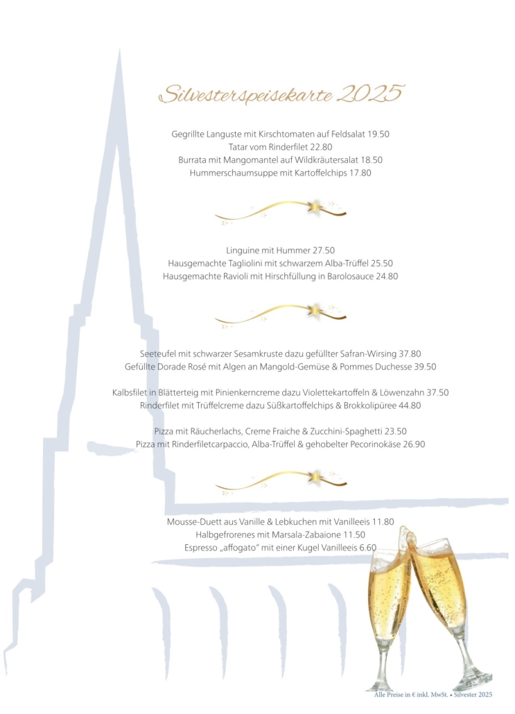 Feiern Sie mit uns Silvester – ohne Sperrstunde! Zusätzlich zu unserem Silvestermenü können Sie auch aus einer kleinen Speisekarte wählen.